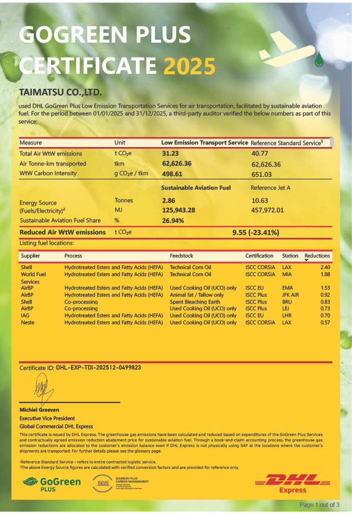 TAIMATSU株式会社は、DHLのGoGreen Plusプログラムを通じてサステナブル航空燃料(SAF)を活用し、2025年の輸送におけるCO₂排出量を全体で23.7%削減することに成功しました。